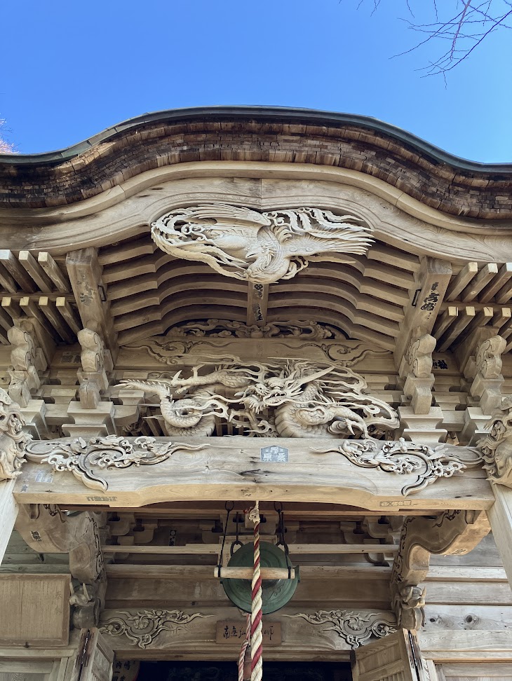 (弘智堂正面の彫刻「鳳凰」と「龍」)