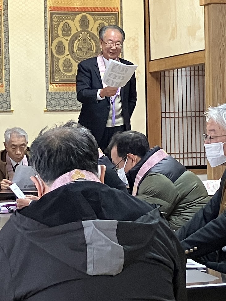 開催時刻が近づいてきてもまだ来ない檀家さんもけっこういたりして黄色信号が灯りかけたのですが、なんとか皆さん集まることができてほっとしたところで「総会」がスタートしました。