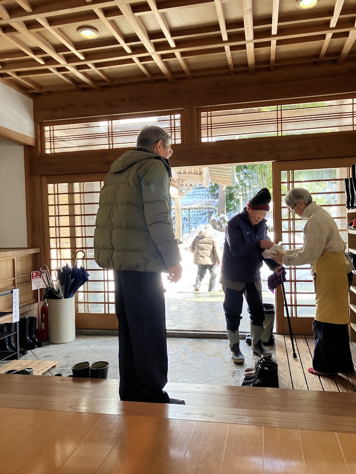 (御祈祷したばかりの「年始のお札」とお弁当を手にお帰りになる檀家の皆さん)